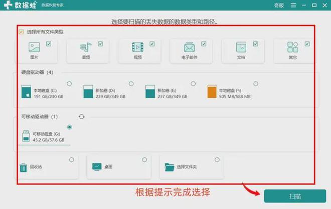 第1步:打开软件后进行扫描设置,选择目标U盘和目标文件的类型后,直接点击“扫描”按钮,进入软件的扫描结算界面;